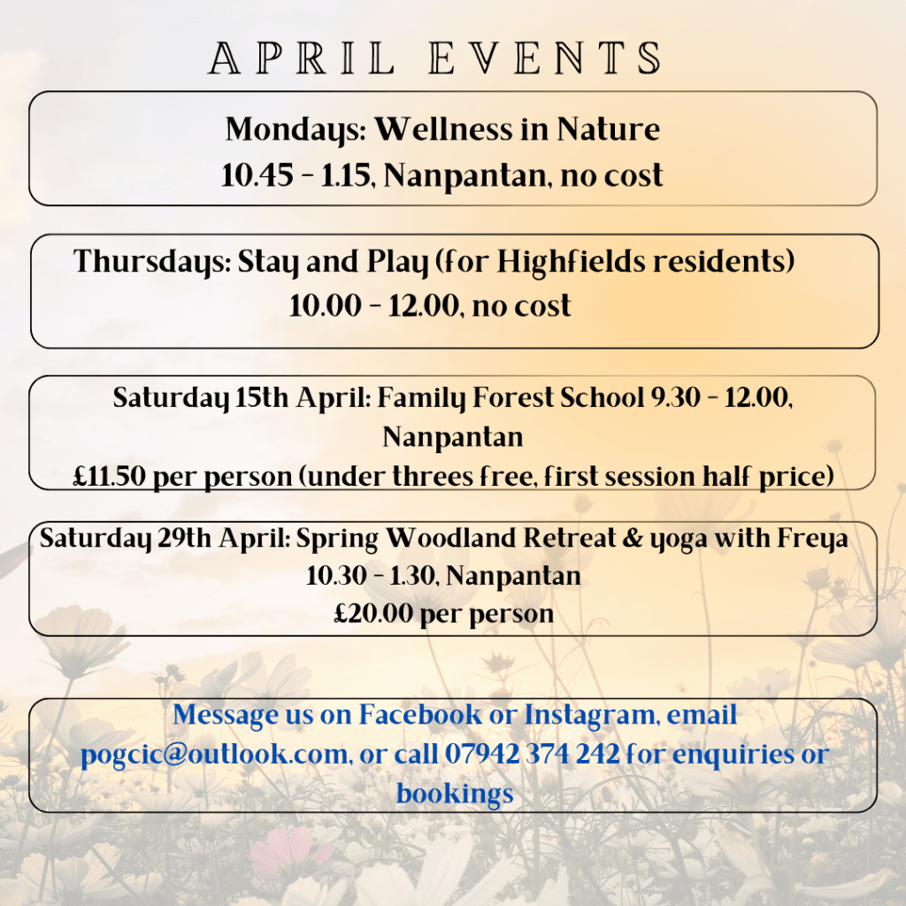 🌿Our regular groups also return after the Easter break. Wellness in Nature is a supportive group for people with mild to moderate mental health difficulties. We meet on Monday mornings, and sessions include “second breakfast” and lunch cooked on the fire. These are no cost sessions.